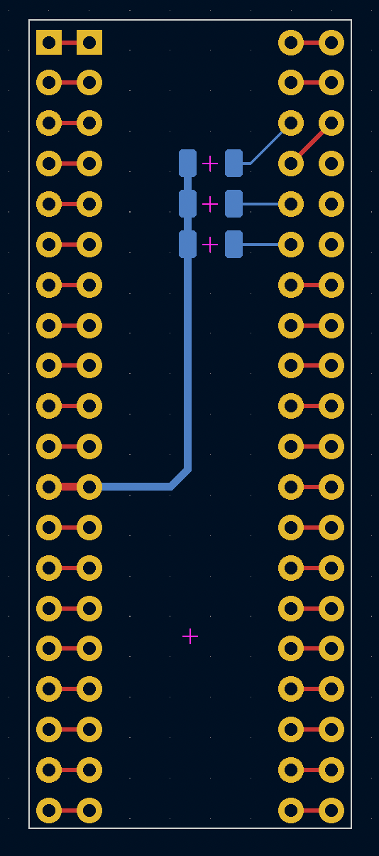 最後におまけ。TMS9118 to TMS9128 Adapterの銅箔層の画像。本体に刺さるピンとTMS9128が刺さるピンが0.1インチオフセットしてレイアウトされています。左からTMS9128の1-20ピン、本体側の1-20ピン、少し右に行って、TMS9128の21-40ピン、本体側の21-40ピンです。基本的にはTMS9128と本体とで同じピン番号を直結しますが、TMS9118とTMS9128でピンアサインが違う35ピンから38ピンに特別な配線がされています。TMS9128と本体の38ピンが接続されていないので、本体のコンポジットビデオ端子から映像信号が出なくなるように見受けられます。